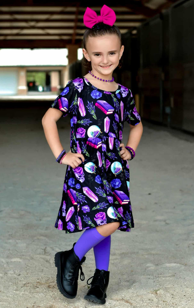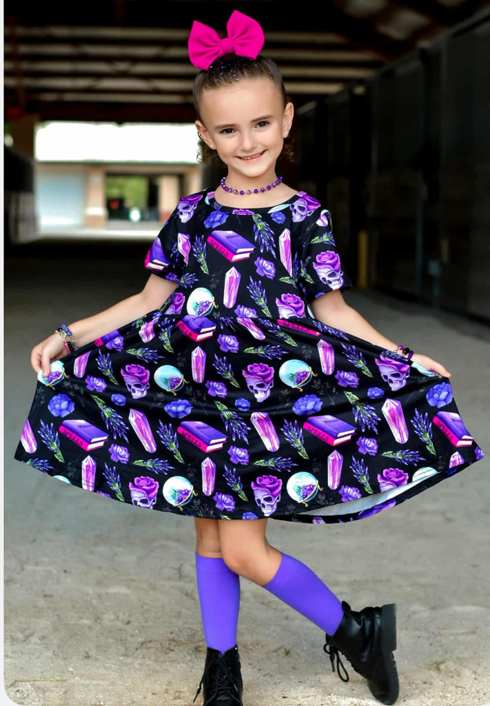 Ready to ship Spell Books Dresses are extras from our Purple Preorder.  Sizes and quantities are very limited for ready to ship.  When offered as preorders, the size range is 3/6mo through 14/16yr.
