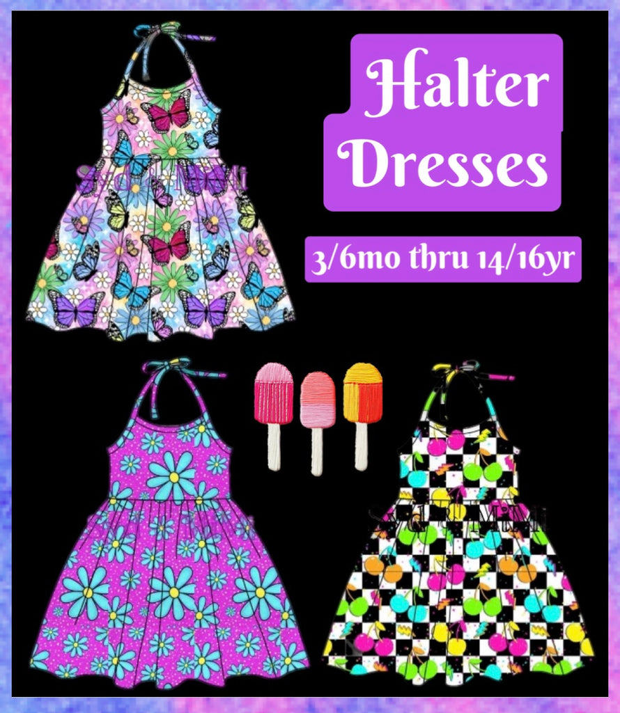 Summer Fun Halter Dresses and Sets will be available for preorder mid February in sizes 3/6mo thru 14/16yr.