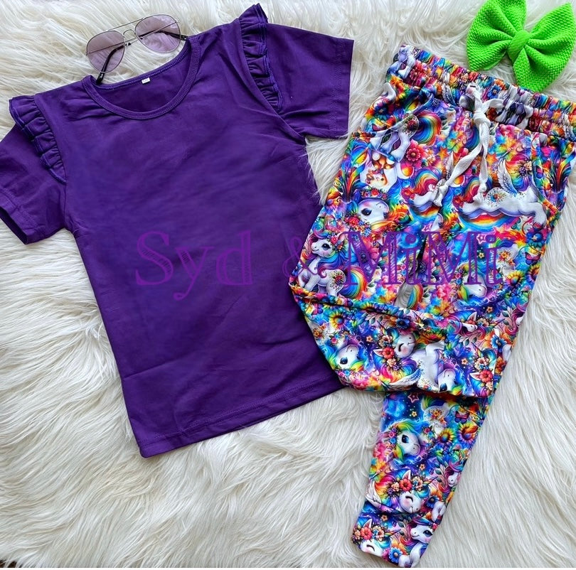 Ready to ship Rainbow Unicorn Joggers were part of our Holiday Pink Preorder. Extras are limited in sizes and quantities. When preordered, the size range is much larger at 3/6mo through 14/16yr and some prints are available in adult sizes.